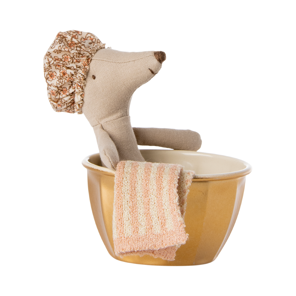 Die große Mäuseschwester badet in ihrer hübschen Badewanne aus Metall. Sie trägt eine Badekappe und ist zusätzlich mit einem Badetuch ausgestattet – so kann der Wellnesstag beginnen!