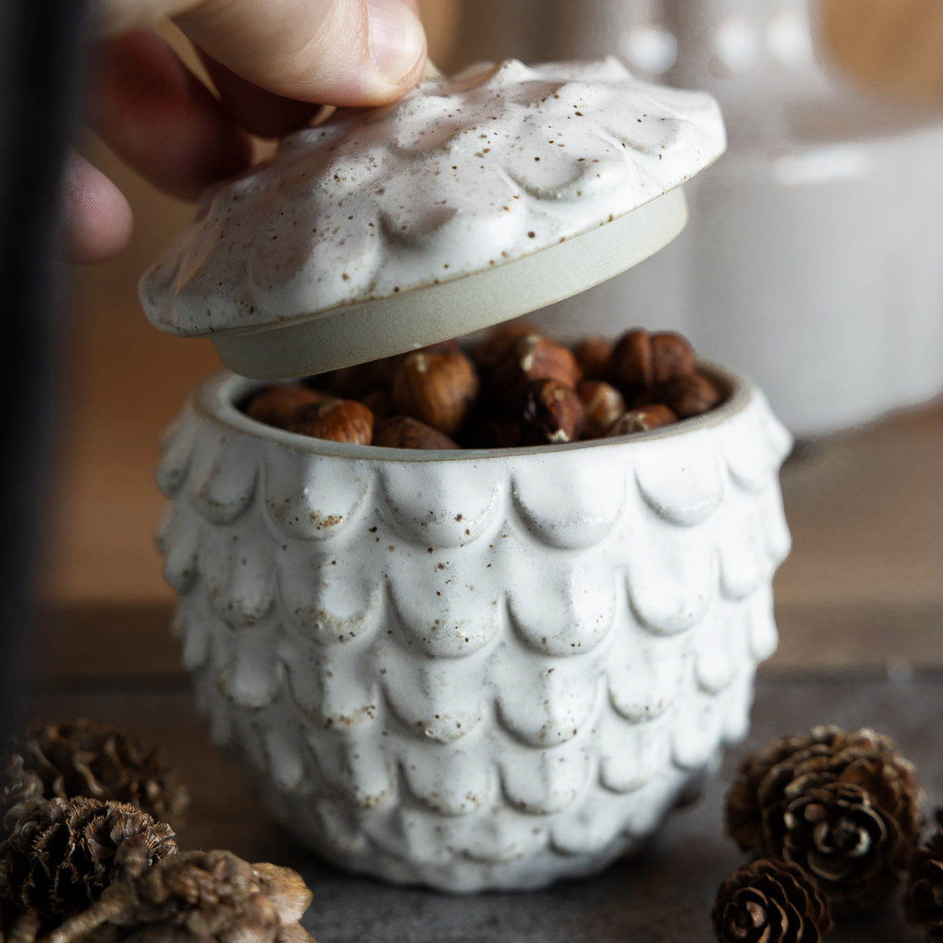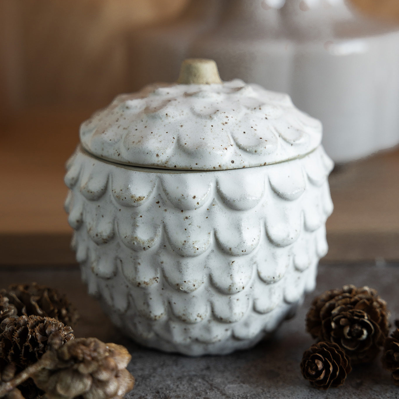 Ein Keramikgefäß in Form eines Tannenzapfens. Ein schönes und funktionales Stück, perfekt zum Aufbewahren von Leckereien, Snacks oder als dekorativer Akzent.