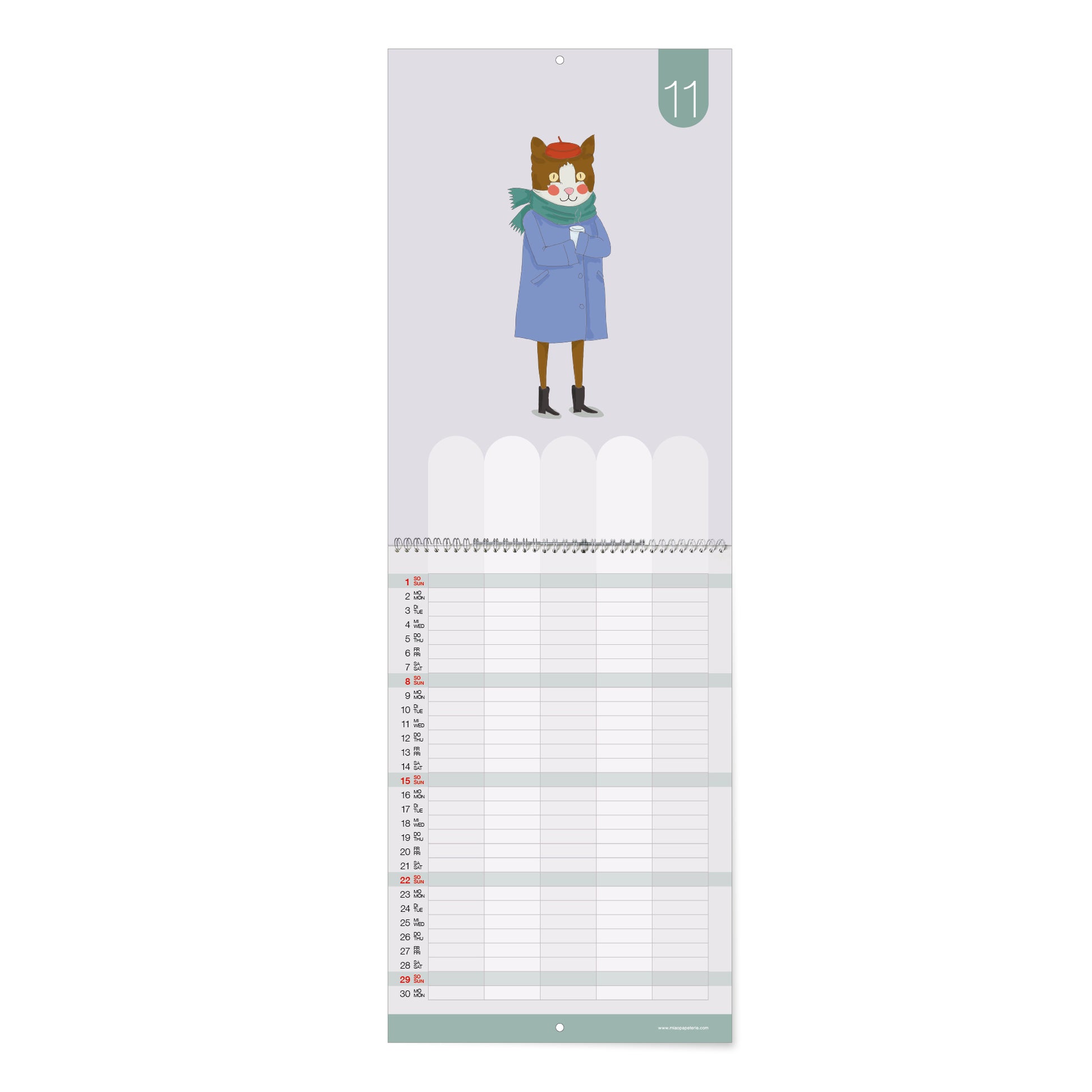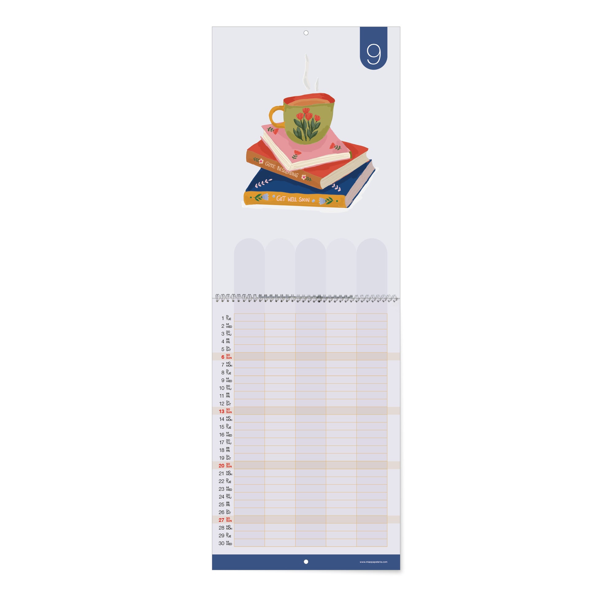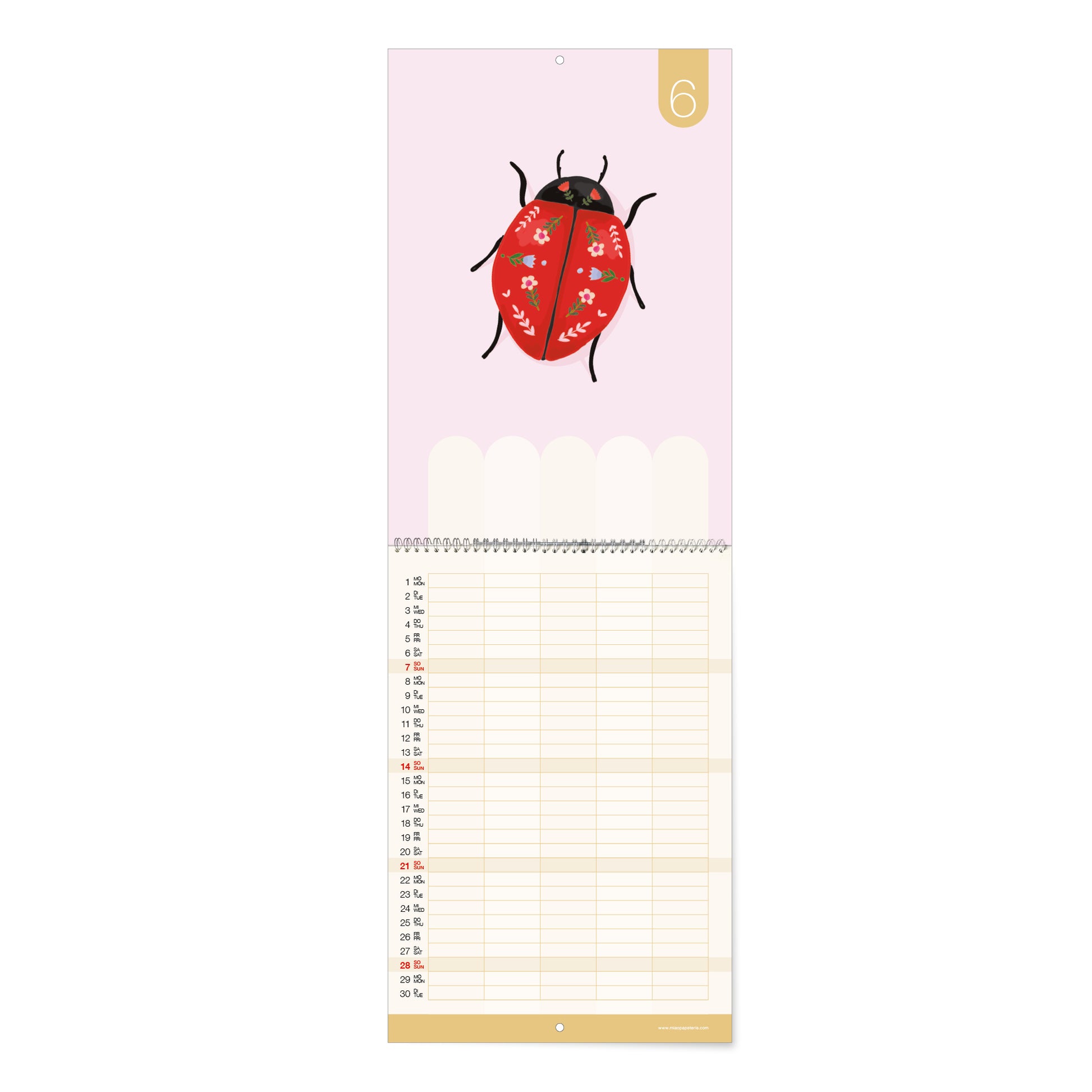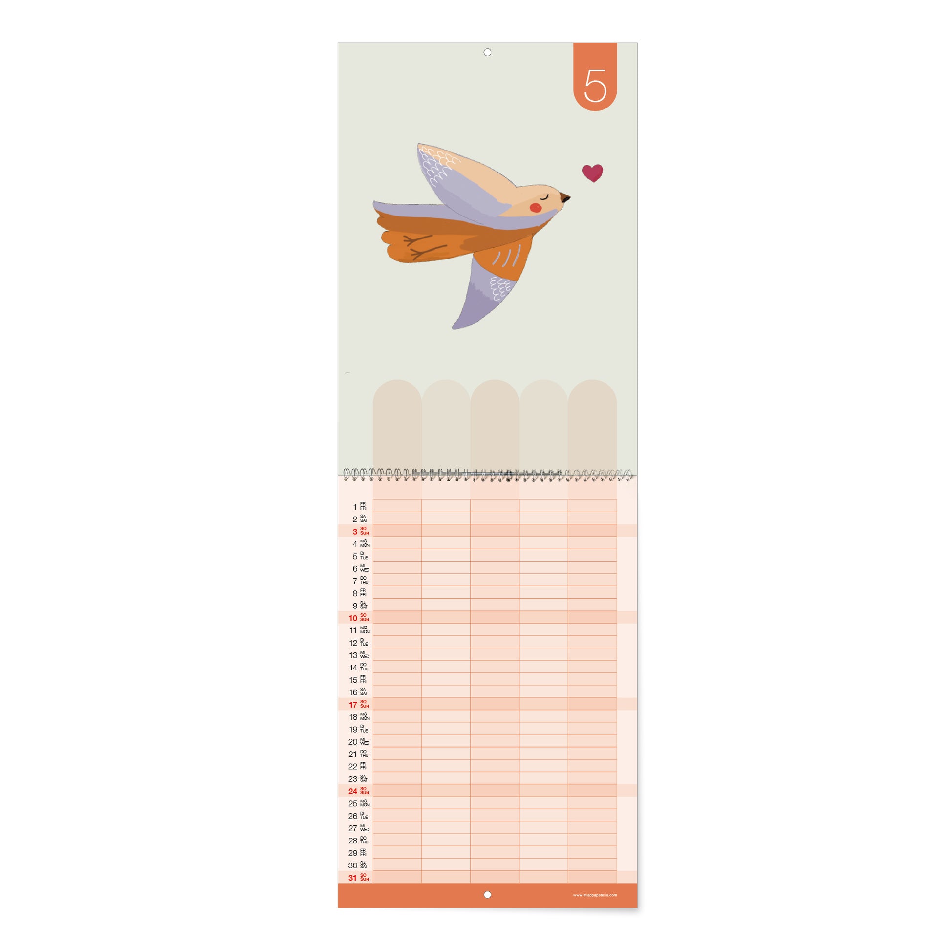 Der Kalender bietet 5 Spalten für eine klare und einfache Planung von Familie, WG oder Team. 12 liebevoll gestaltete Monatsmotive begleiten dich durchs Jahr und machen jede Seite zu einem kleinen Highlight.