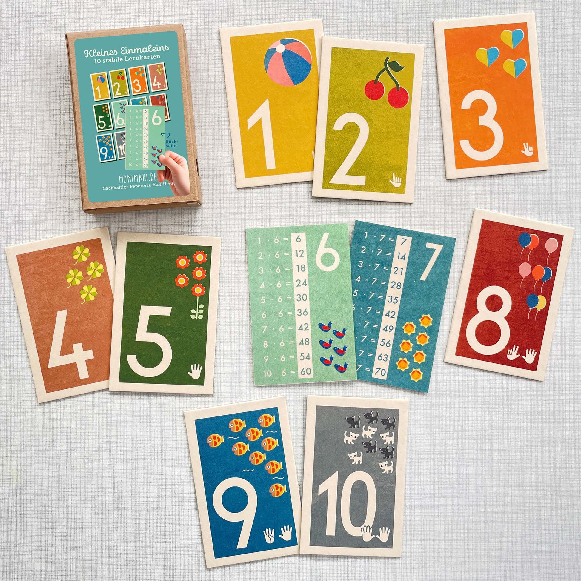 Das kleine Einmaleins auf 10 stabilen Lernkarten in einer Kraftkarton-Box. Super praktisch zum Lernen des Zahlenraums von 1-10 und des kleinen Einmaleins. Vorne die Zahlen, hinten das Einmaleins – bunte Farben und liebevolle Illustrationen tragen zu einem positiven Lernerlebnis bei.
