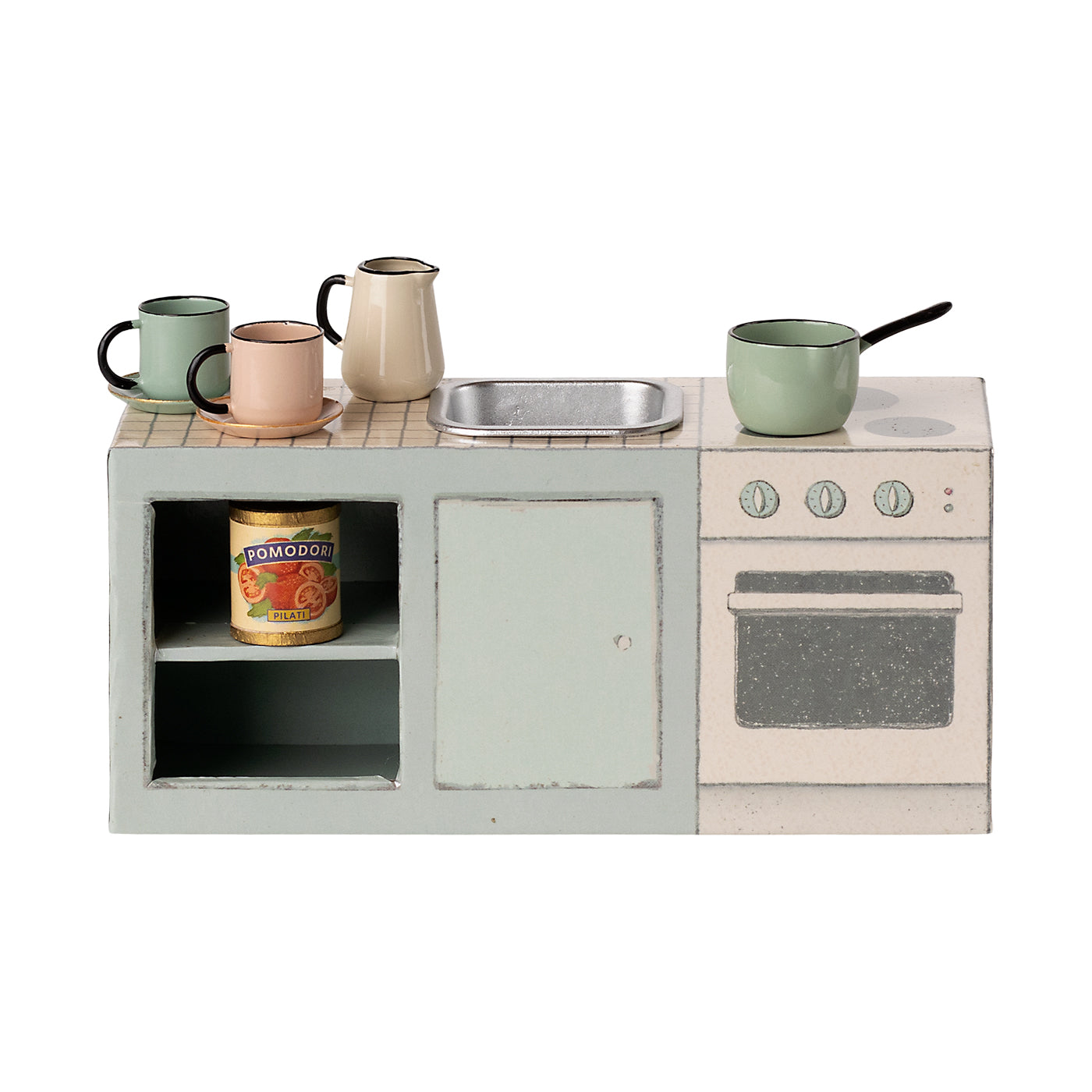 Die kleine Küchentheke beinhaltet 2 Tassen, 2 Teller, einen Topf, einen Krug sowie eine kleine Dose. Das kleine Waschbecken ist aus Metall gefertigt, um so echt wie möglich auszusehen. Sie passt perfekt in die Küche im SuitCasa-Mäusehaus.