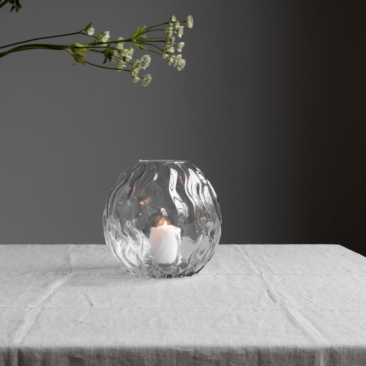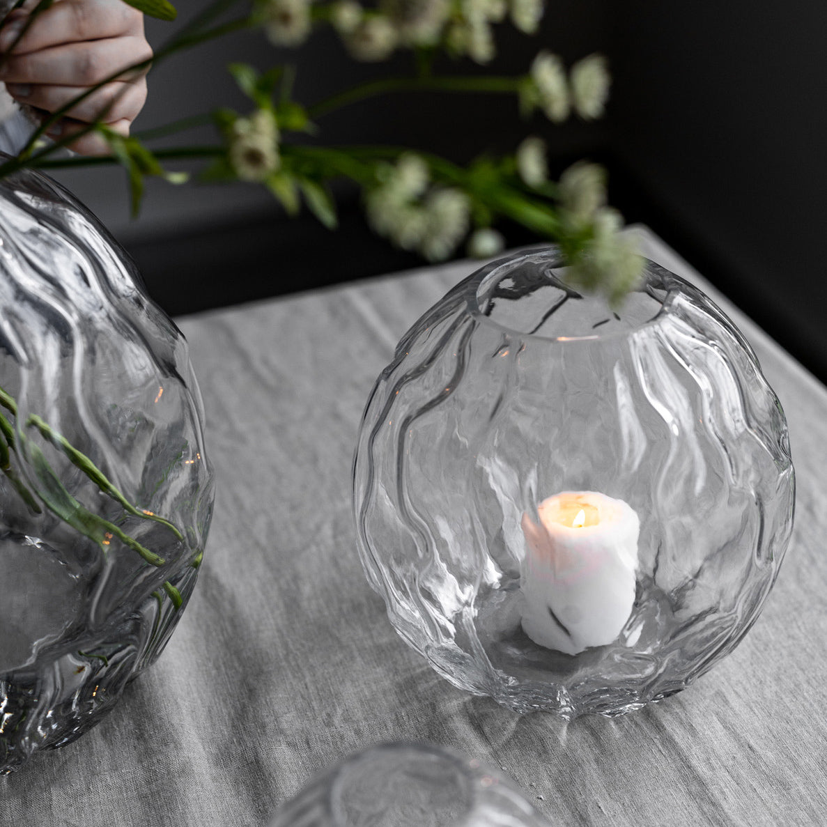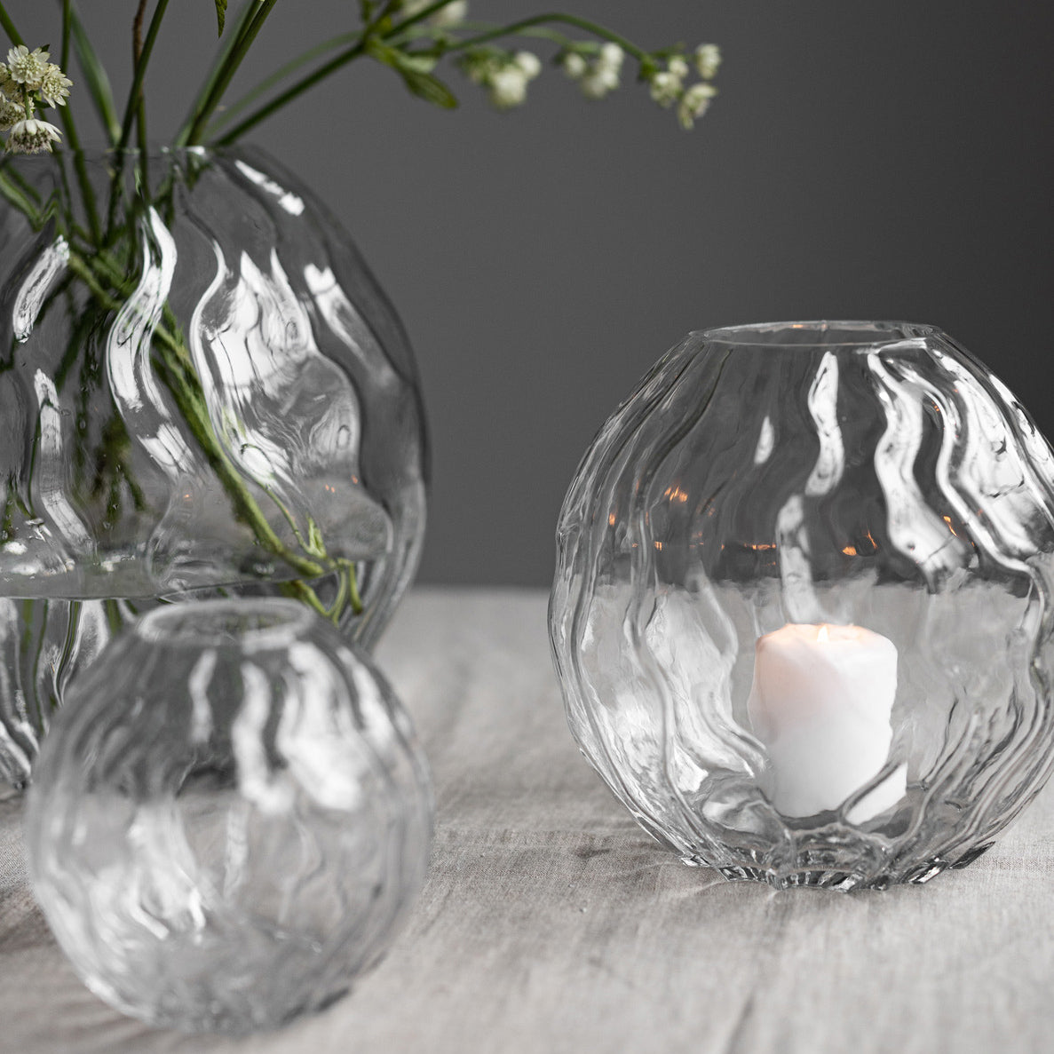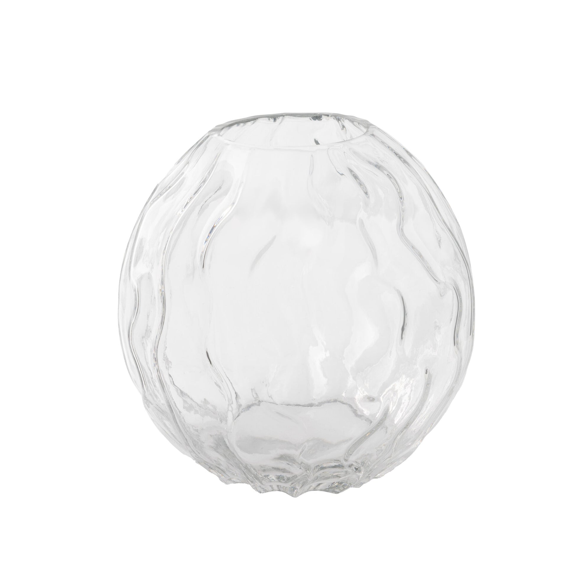Eine von der Natur inspirierte, aus glas gefertigte Vase. Mit ihrer wellenförmigen Form erinnert sie an Wind und Meer. Stelle sie auf den Couchtisch und fülle sie je nach Jahreszeit. Auch im Bücherregal macht sie sich gut als Einrichtungsdetail.