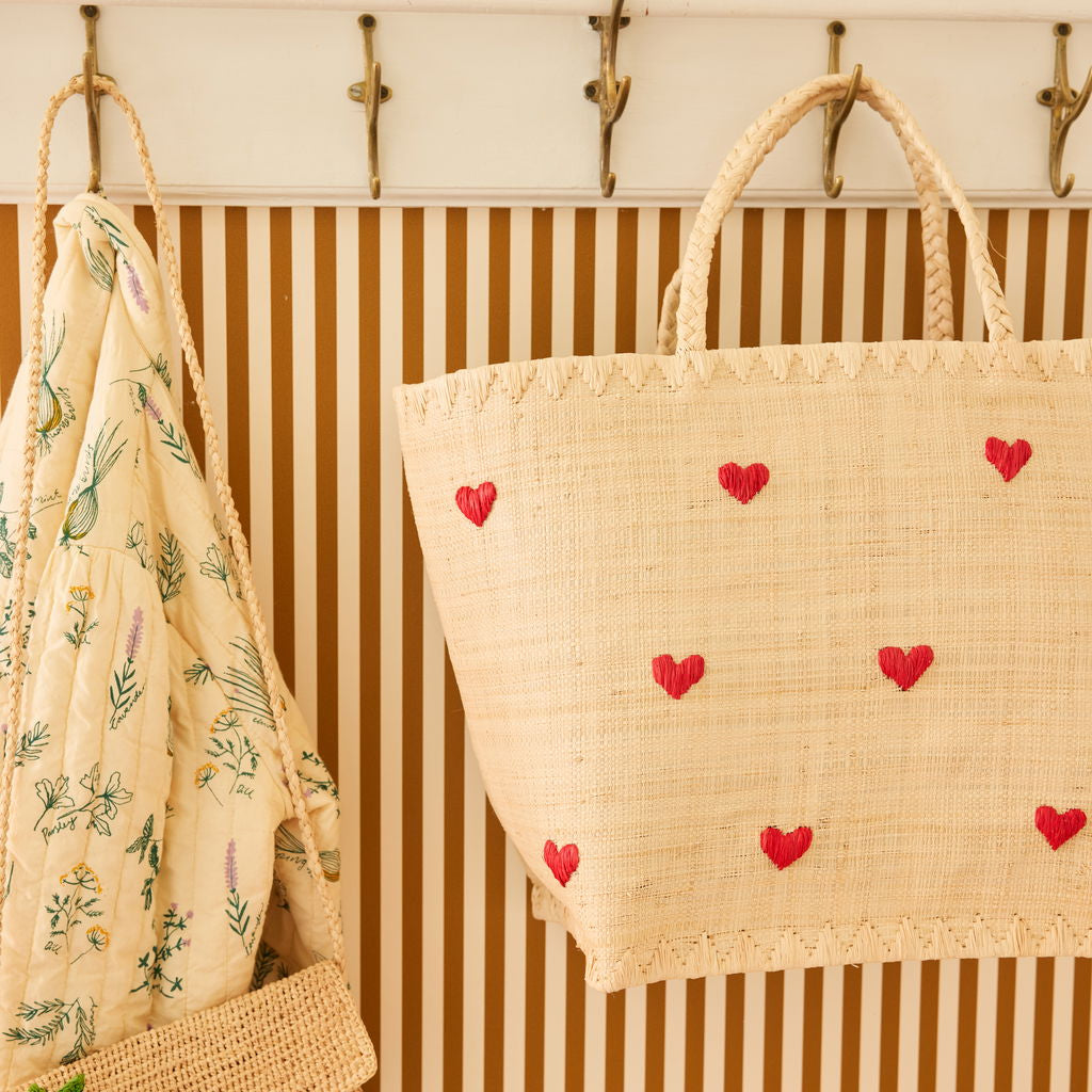Die Raffia-Tasche mit Herzchen begeistert mit ihrem liebevollen Design und ihren geflochtenen Griffen. Gefertigt aus dem natürlichen Material Raffia verbindet sie Leichtigkeit mit Stabilität und wird zum stilvollen Begleiter für Alltag, Shopping oder besondere Anlässe. Die verspielten Herzdetails verleihen der Tasche einen charmanten Look, der sofort ins Auge fällt.