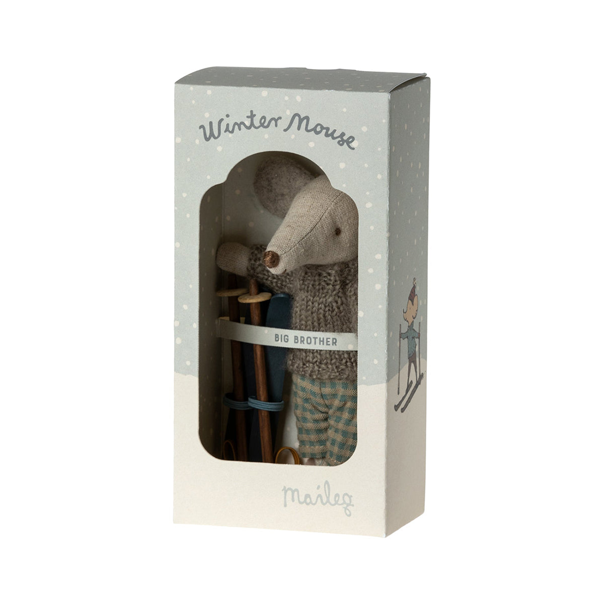 Diese Skifahrer-Maus kommt im Set mit warmem Strickpullover, einer Hose und einem Paar Ski und Stöcken. Erhältlich in zwei verschiedenen Ausführungen: mit und ohne Mütze. Die Maus ohne Mütze hat wollwarmen Ohren, die aussehen, als würde die Maus Ohrenwärmer tragen.