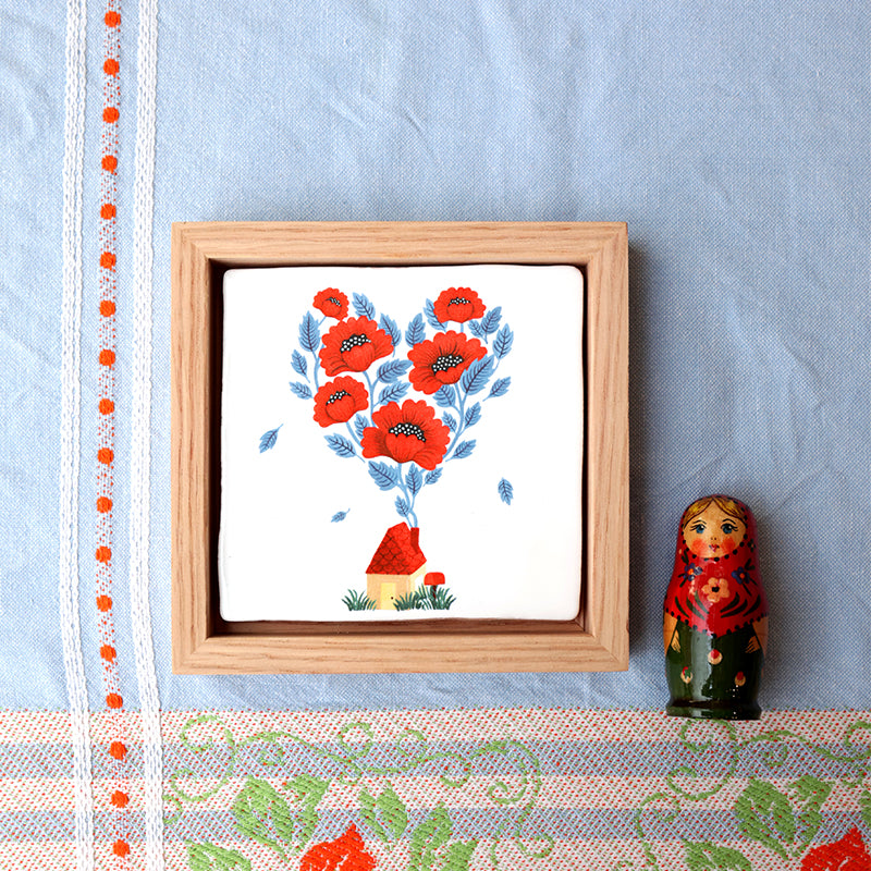 Dekorative Fliese mit schöner Illustration. Kann dank der auf der Rückseite angebrachten Aufhängung ganz einfach an die Wand gehängt werden, aber auch als Untersetzer verwendet, aufgestellt oder gefliest werden.