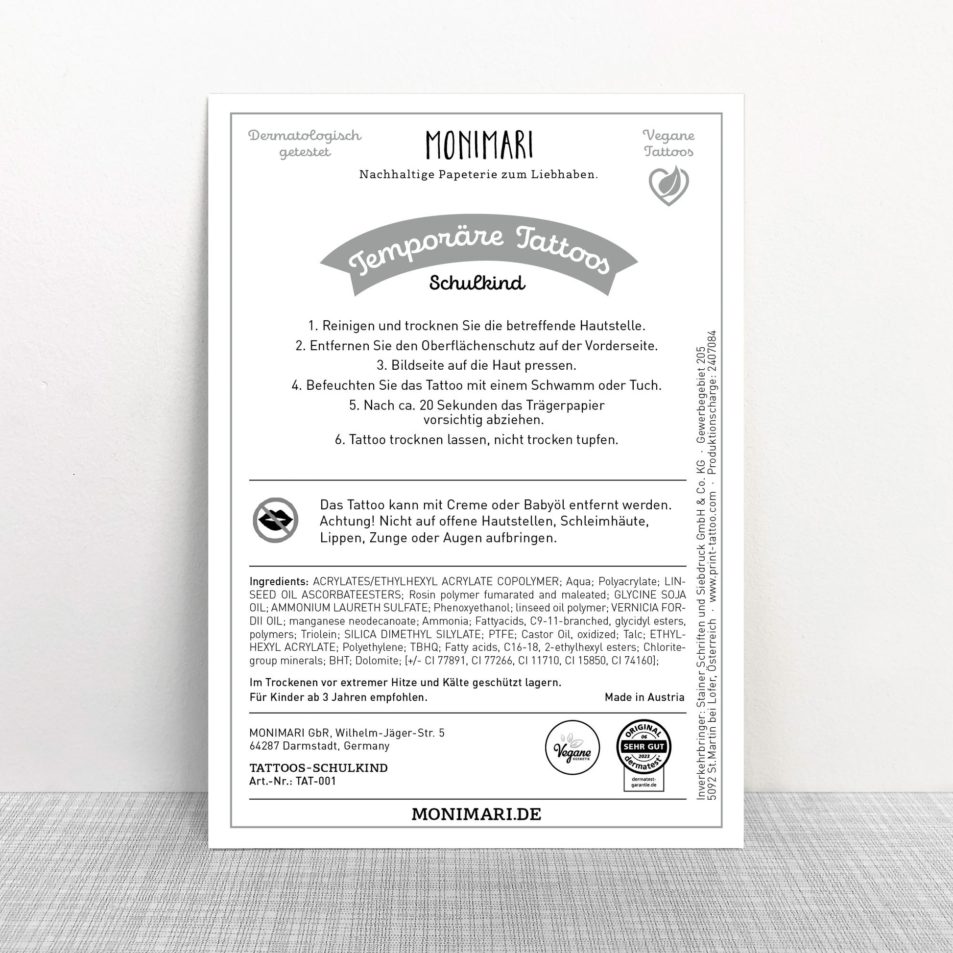 Monimari-Tattoos sind ein wunderbares Mitbringsel für Kinder! Vegan und dermatologisch getestet, überzeugen sie mit umweltbewusster Papierabdeckung statt Kunststofffolie. Der Tattoobogen wird in Österreich gedruckt, die Verpackung klimaneutral in Deutschland.